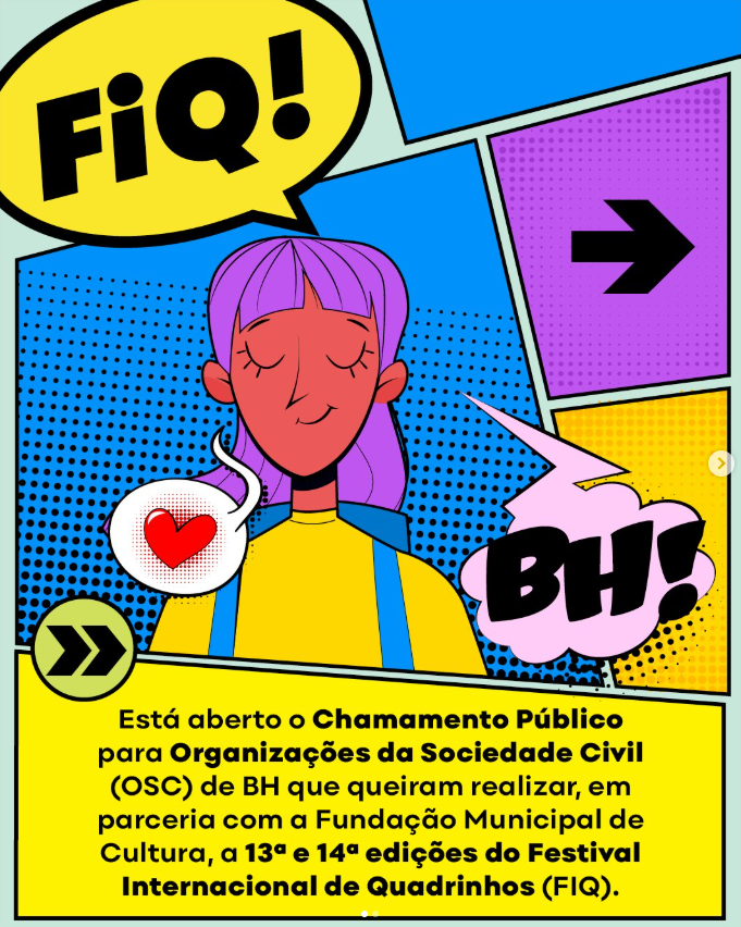 Objeto: Chamamento Público para selecionar propostas de Organização da Sociedade Civil – O.S.C., para realizar a 13ª e 14ª EDIÇÕES DO FESTIVAL INTERNACIONAL DE QUADRINHOS DE BELO HORIZONTE – FIQ BH, em parceria com a Fundação Municipal de Cultura.