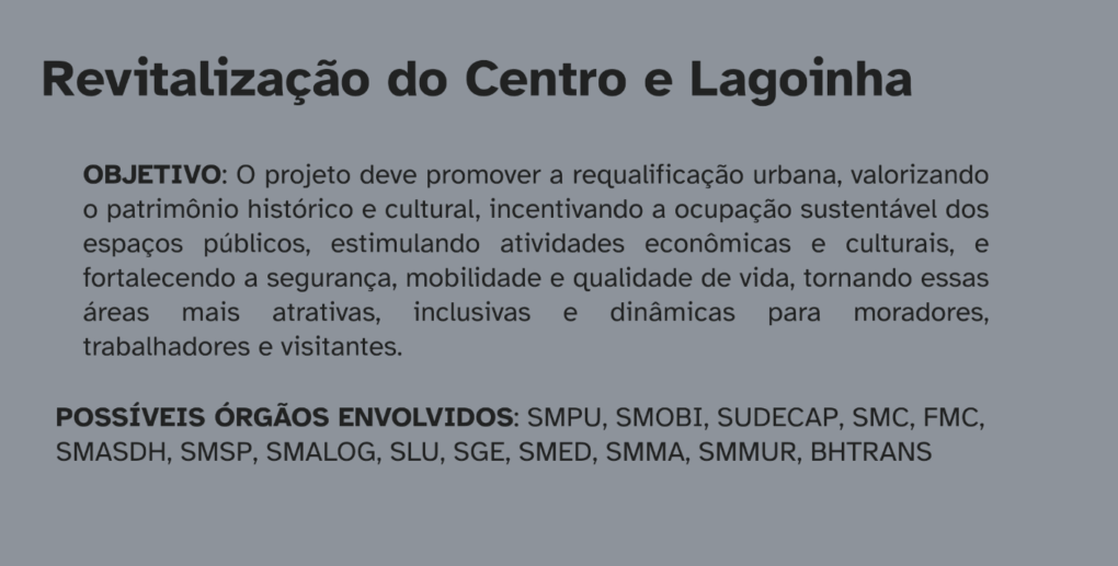 Escopo: Requalificação habitacional; Locação social e transição habitacional; Fomento e regulação de novos estabelecimentos; Novos empreendimentos habitacionais; reuso e redesenho de espaços públicos; promoção da natureza e clima na cidade; fomento ao lazer, esporte e convivência; mobilidade ativa e travessias seguras; ciclomobilidade; transporte coletivo qualificado; acessibilidade universal; acolhimento e transição social; saúde comunitária e atenção de base; segurança cidadã e prevenção; trabalho e reinserção socioeconômica; dinamização do comércio e serviços locais; gastronomia e memória cultural alimentar;inovação e economia criativa; concessões e investimento privado; cultura viva e arte urbana; memória, história epertencimento; turismo cultural e experiência urbana; comunicação e identidade do território.