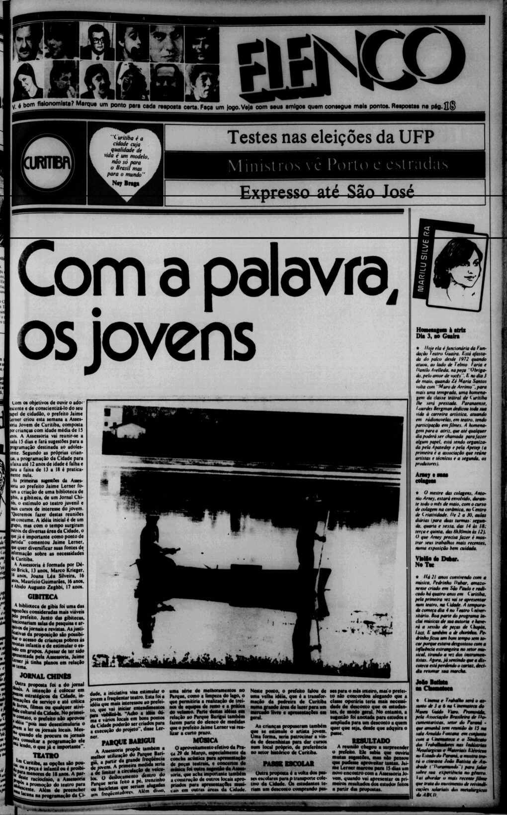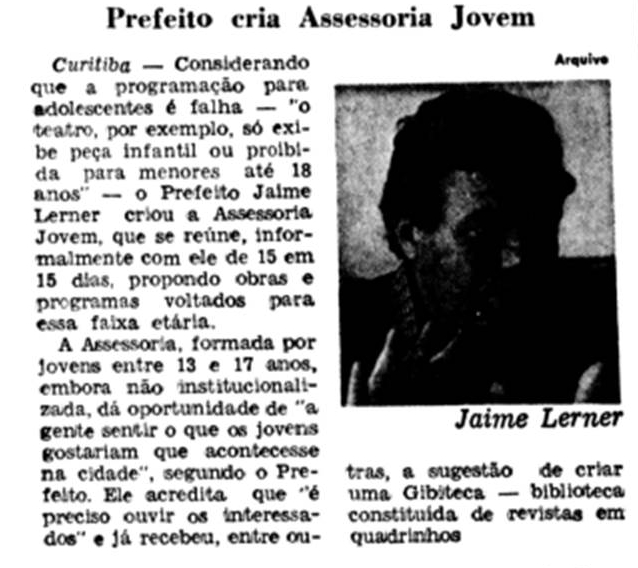 Curitiba – Considerando que a programação para adolescentes é falha – “O teatro, por exemplo, só exibe peça infantil ou proibido para menoresaté 18 anos” – O Prefeito Jaime Lerner criou a Assessoria Jovem, que se reúne, informalmente com ele de 15 em 15 dias, propondo obras e programas voltados para essa faixa etária.