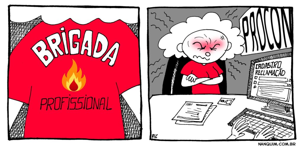 Cartum. Em um cenário de arena de luta, um cartão de crédito segura um cinturão de campeão. Em locaute no chão, a personagem Neusinha com olho vermelho. Texto: O cartão venceu, e me venceu!
