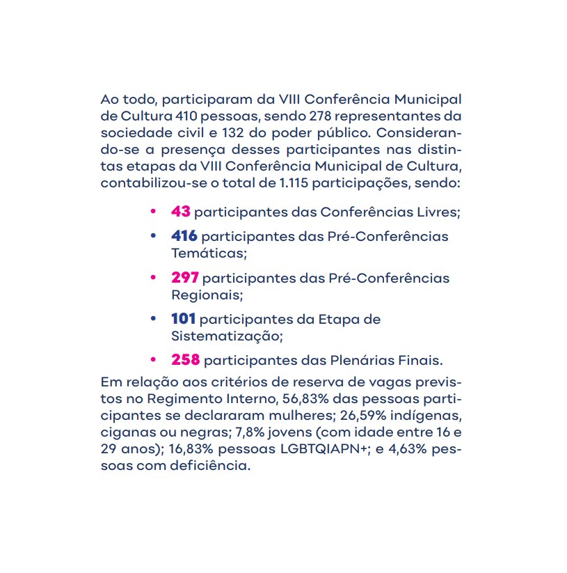 - Fortalecer e ampliar os Fóruns Setoriais e Regionais de Cultura, garantindo-lhes acesso aos recursos públicos para suporte às atividades ordinárias.