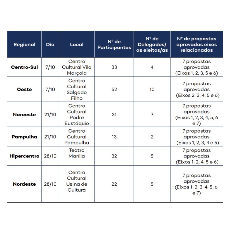 - Realizar mapeamento cultural nas 10 regionais do Município, fortalecendo as políticas municipais de cultura por meio do reconhecimento e do imensionamento do fazer cultural e de sua diversidade nos territórios.