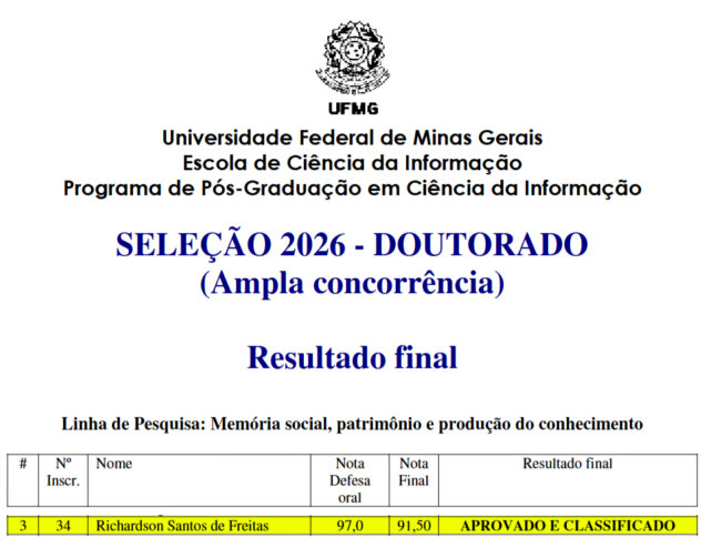 Aprovado no processo seletivo do Doutorado em Ciência da Informação da UFMG – 2026